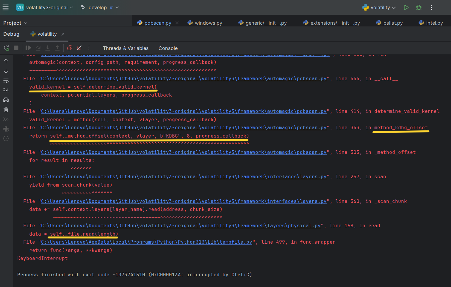 When I tested Volatility3 by running: python vol.py -f M:\memory.pmem windows.pslist.PsList I saw numerous debug prints, and the scan took quite a while. Interrupting the process with Ctrl+C showed the functions call stack, “stuck” in the following function call: data = self._file.read(length).