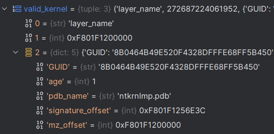 b'KDBG'bytes (_KDDEBUGGER_DATA64->OwnerTag) - a process which takes a lot of time. - Determines the kernel base from the structure by reading the field
