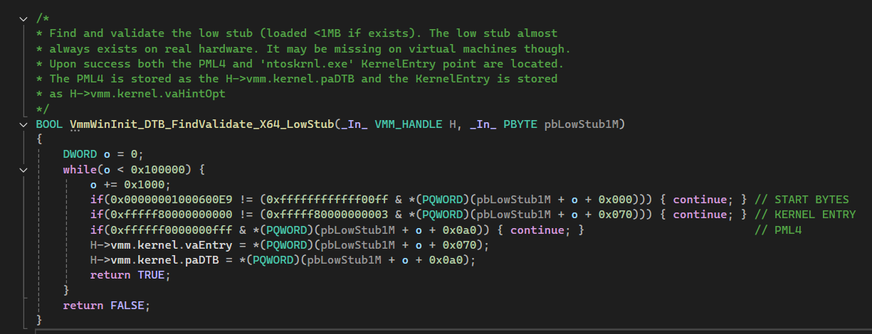 Memprocfs relies on “the most undocumented structure” that Alex Ionescu (video; min 43, slides; slides-46-49) says he’s ever seen - the Low Stub.